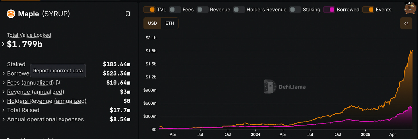 Some credit protocols have scaled without the full credit lifecycle on-chain. In fact the biggest one looks like this: Maple Finance has trusted pools where a single manager approves loans and signs off-chain legal contracts. These pools are a step above the Iron Bank deal but they are still not a fully on-chain protocol. This has brought in $2B in TVL earning 10% APY for depositors to Maple pools. While deposits are via smart contract, loan terms and enforcement are all in the off-chain fiat legal system. Maybe this is the optimal solution? To be continued.
